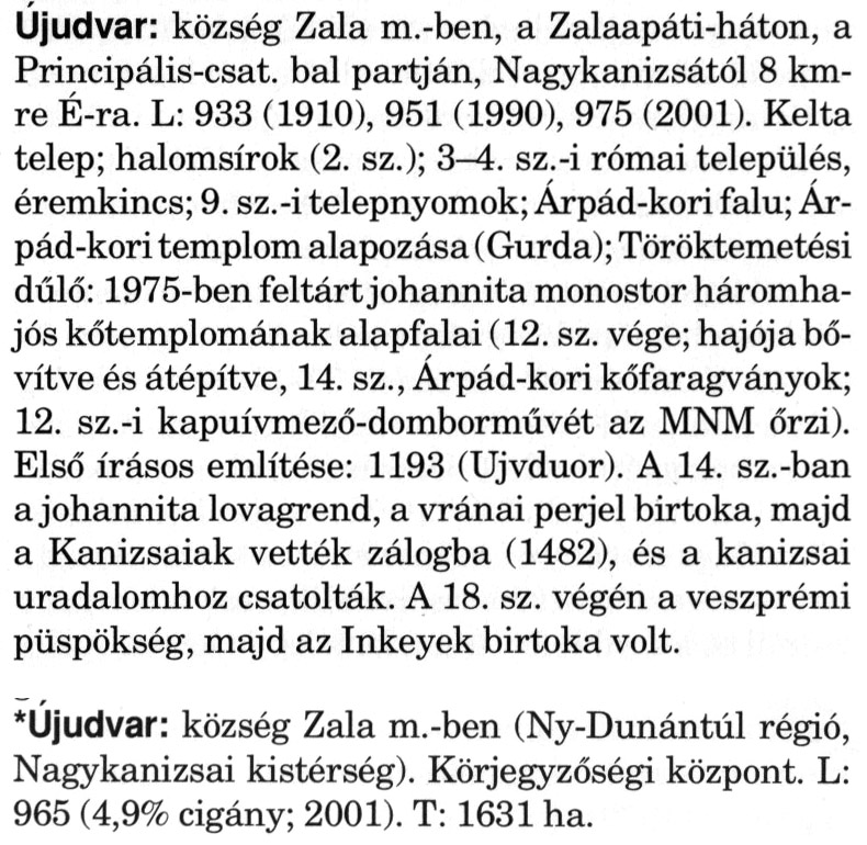 Nyilvános 2162 | 6017 | A szócikkek felismertetett szövege: | (A csillag után a kiegészítő kötetből származó szöveg következik) Újudvar: község Zala m.-ben, a Zalaapáti-háton, a Principális-csat. bal partján, Nagykanizsától 8 km-re É-ra. L: 933 (1910), 951 (1990), 975 (2001). Kelta telep; halomsírok (2. sz.); 3-4. sz.-i római település, éremkincs; 9. sz.-i telepnyomok; Árpád-kori falu; Árpád-kori templom alapozása (Gurda); Töröktemetési dűlő: 1975-ben feltárt johannita monostor háromhajós kőtemplomának alapfalai (12. sz. vége; hajója bővítve és átépítve, 14. sz., Árpád-kori kőfaragványok; 12. sz.-i kapuívmező-domborművét az MNM őrzi). Első írásos említése: 1193 (Ujvduor). A 14. sz.-ban a johannita lovagrend, a vránai perjel birtoka, majd a Kanizsaiak vették zálogba (1482), és a kanizsai uradalomhoz csatolták. A 18. sz. végén a veszprémi püspökség, majd az Inkeyek birtoka volt. *Újudvar: község Zala m.-ben (Ny-Dunántúl régió, Nagykanizsai kistérség). Körjegyzőségi központ. L: 965 (4,9% cigány; 2001). T: 1631 ha. A szócikkek a következő lexikonból származnak: Cím: Magyar nagylexikon Közreműködő: Élesztős László (1949) (szerk.) ; Barabás Éva (1943) (szerk.) ; Berényi Gábor (1946) (szerk.) ; Bárány Lászlóné (szerk.) ; Adelmann-né Kertész Judit (1945) (közrem.) ; Froemel Károlyné Jáky Éva (1936) (közrem.) ; Akadémiai Kiadó és Nyomda Vállala Szerz. közl.: [... Élesztős László főszerk.] ; [szerk. Barabás Éva et al.] ; [bibliogr. Adelmanné Kertész Judit] ; [kész. az Akadémiai Kiadó Magyar Nagylexikon Szerkesztőségében] Kiadás: Budapest : Akad. K., 1993- Kötetei: 1. köt., A - Anc 2. köt., And - Bag 3. köt., Bah - Bij 4. köt., Bik - Bz 5. köt., C - Csem 6. köt., Csen - Ec 7. köt., Ed - Fe 8. köt., Ff - Gyep 9. köt., Gyer - Iq 10. köt., Ir - Kip 11. köt., Kir - Lem 12. köt., Len - Mep 13. köt., Mer - Nyk 14. köt., Nyl - Pom 15. köt., Pon - Sek 16. köt., Sel - Szö 17. köt., Szp - Ung 18. köt., Unh - Z 19. köt., Kiegészítő kötet, A - Z ETO jelzet: 030=945.11 Szakjelzet: 030 Cutter: M 14 ISBN: 963-05-6611-7 [!ISBN 963-05-6615-X] Nyelv: magyar Megjegyzés: Az 5. kötettől kiad. a Magyar Nagylexikon Kiadó ; A 6. kötettől főszerk. Berényi Gábor ; A 6. kötettől szakszerk. Bárány Lászlóné et al. ; A 6. kötettől bibliogr. Froemel Károlyné ; Bibliogr. a szócikkek végén |